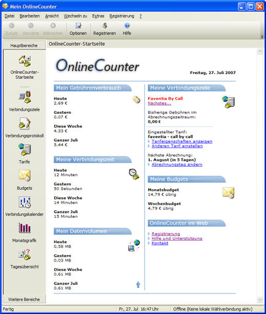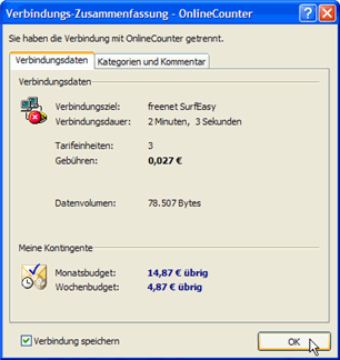 Sie können sich nun wie gewohnt im Internet einwählen. Es ist nicht notwendig, die Verbindung mit OnlineCounter auf- und abzubauen, sondern OnlineCounter braucht nur gestartet sein, was an dem Programmsymbol in der Taskleiste zu erkennen ist.